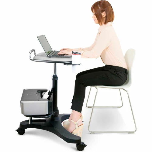 Sit/Stand Mobile Laptop Workstation with Gas Cylinder Pole, High Impact ABS Plastic Top with Printer Shelf in Black Finish.