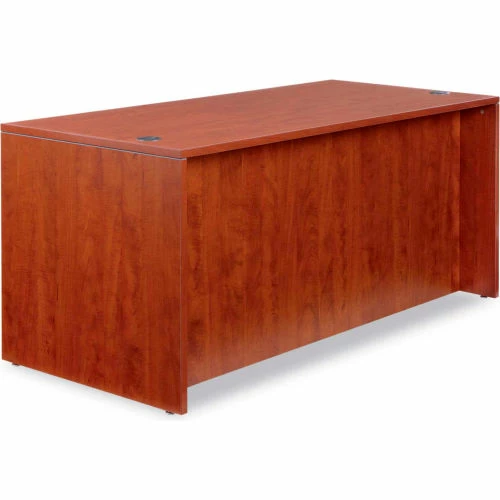 Commercial-grade laminate worksurface and side panels are water-, scratch- and stain-resistant. Charcoal accent line under worksurface adds a distinctive touch. Protective 3 mm PVC edge banding helps prevent damage from bumps. Two grommets for cable and wire management. Full-length modesty panel for privacy. Use alone or combine with Return/Bridge Shell to create an “L” grouping; add a Credenza Shell to form a complete “U” workstation. Color: Medium Cherry; Top Shape: Rectangular; Top Material: Woodgrain Laminate. Compliance Standards: GREENGUARD Indoor Air Quality Certified®; Meets or exceeds ANSI/BIFMA standards. For Use With: Alera® Valencia Series Reversible Return/Bridge Shell and Credenza Shell.