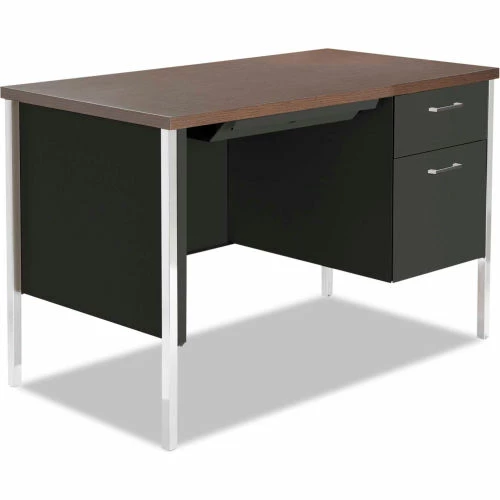 Durable square edge laminated top is scratch- and stain-resistant. Powder coated steel frame with chrome-plated 1″ square tubular steel legs. Full-extension locking file drawer with telescoping ball bearing slides accommodates hanging file folders. Box drawer with dividers operates on steel roller suspensions. Center drawer lock secures all drawers. Aluminum drawer handles. Three-quarter height modesty panel provides privacy. Leveling glides adjust for uneven floors.