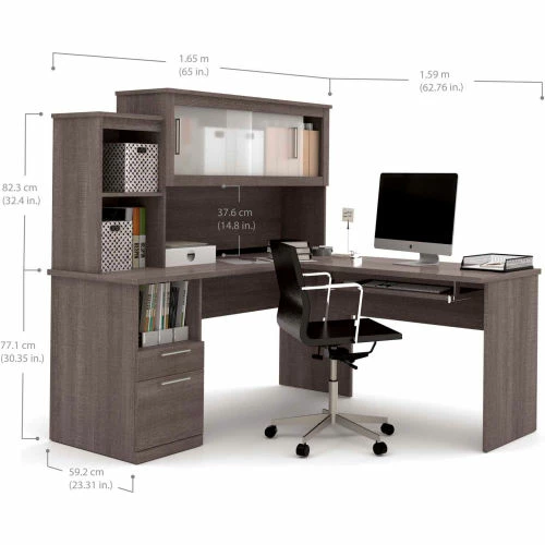 Dayton by Bestar desk is distinguishable by its large work surfaces and multiple areas of open and closed storage. Durable 1″ commercial grade work surfaces with melamine finish that resist scratches, stains and wear. Pedestal with one utility drawer and one file drawer. File drawer with letter/legal filing system. Side section with open storage and 1 fixed shelf. The keyboard shelf is on ball-bearing slides for smooth and quiet operation. Sliding frosted glass doors with metals handles. Wire management system. Fully reversible.