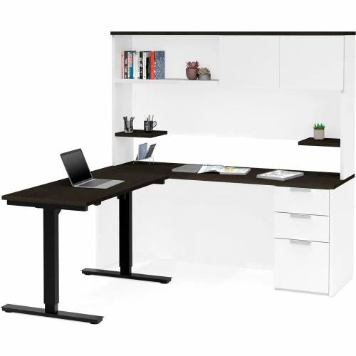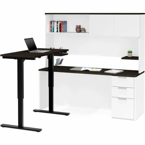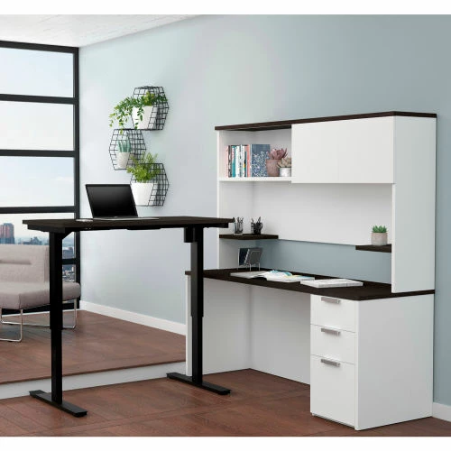 Bestar® Height Adjustable L-Desk with Hutch – White and Deep Gray – Pro-Concept Plus Series