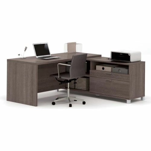 Pro-Linea has all the elements to create a modern and refined work environment. The clean lines of this collection bring a fresh look without compromising functionality and durability. The work surface is made of a durable 1.5″ commercial grade work surface with melamine finish that resists scratches, stains and wear. The Credenza is made of a durable 1″ commercial grade work surface with melamine finish. The Return table features a deluxe impact resistant PVC edge. The credenza features one utility drawer, one file drawer with letter/legal filing system and three shelves, one of which is adjustable for additional flexibility. Drawers are mounted on ball-bearing slides for smooth and quiet operation. Square metal legs in matte silver finish. The Legs feature levelers to adapt to any floor irregularities. The workstation is fully reversible. This unit meets or exceeds ANSI/BIFMA performance standards.