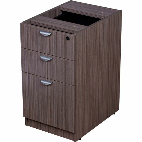 The deluxe locking pedestal has two box drawers and a file cabinet. The Driftwood laminate is durable yet attractive