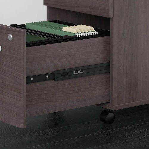 Two box drawers hold your pens, notepads, small office supplies and more to organize your workspace. The file drawer opens on full-extension ball-bearing slides, making it easy to reach those pesky papers all the way at the back. Dual-wheeled, hooded casters keep the 3 drawer cabinet moving wherever you want or remain in place on your office floor or carpet. A single lock secures the bottom 2 drawers to keep your paperwork private. When space is at a premium, the Mobile File Cabinet conveniently fits under your desk. Eye-catching Brushed Nickel drawer pulls complement the White or Storm Gray finish to make the cabinet as attractive as it is functional.