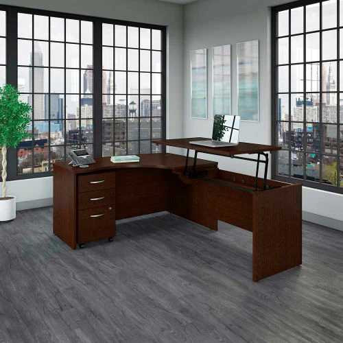 The Bush Business Furniture Series C Right Hand 3 Position Sit to Stand L-Shaped Desk with Mobile File Cabinet offers an ergonomic workspace for the health-conscious professional. A 60″W x 43″D Bow Front Desk and a 42″W x 24″D Sit to Stand Return attach to form a space-saving configuration, and both feature scratch-resistant 1 inch thick thermally fused laminate surfaces with wire management. The inviting Bow Front design extends the surface of the desk so guests are able to pull up a chair and collaborate.