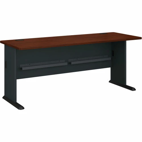 Enjoy loads of workspace and legroom with the Bush Business Furniture Series A 72W Desk. An open C-Leg design creates user comfort while a comprehensive wire management system keeps computer cables out of your way for a clean look. Spread out with a laptop, printer, phone and more on the scratch-resistant thermally fused laminate surface. Durable edge banding and thick end panels fend off damage to ensure lasting quality. Sturdy Desk feet include encapsulated steel armature and adjustable levelers for use on all types of flooring. The Office Desk accepts a coordinating Hutch, Mobile File Cabinets, Keyboard Tray or Pencil Drawer (all sold separately). Use the Desk in a home or business office or even in a classroom. The expansive surface provides enough workspace for one or two students. Series A completes your multi-person workspace, home office or anywhere in between with a variety of configuration options. Featuring 7 attractive two-tone finishes and contemporary styling, this commercial office furniture adapts to your surroundings. Customize any environment with a full line of affordable products, all backed by a 10 Year Warranty. Series A withstands the rigors of a 40-plus hour week and meets ANSI/BIFMA quality test standards. American made with U.S. and imported parts.