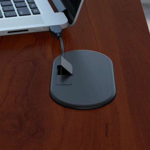 - Wire management system includes leg and desktop grommets with channels on the modesty panel to keep cables under control