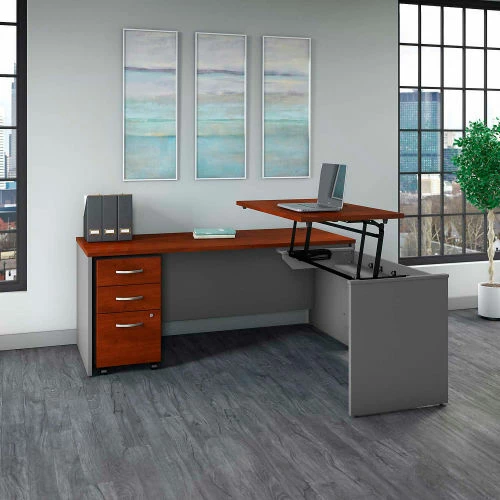 Fixed desks and storage are tested to meet ANSI/BIFMA standards for safety and performance, and the mechanical lift system is rigorously tested to meet Bush Business Furniture’s own quality standards. This office furniture set comes in your choice of stylish Mocha Cherry or Hansen Cherry with Graphite Gray finishes and is backed by a 10 year manufacturer’s warranty. American made with U.S. and imported parts.