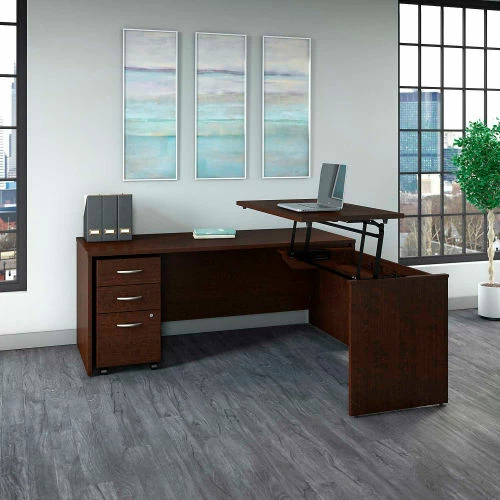 The Bush Business Furniture Series C 3 Position Sit to Stand L-Shaped Desk with Mobile File Cabinet offers an ergonomic workspace solution for the health-conscious professional. A 72″W x 30″D Office Desk and 42″W x 24″D Sit to Stand Return attach to form a space-saving corner desk design, and both feature scratch-resistant 1 inch thick thermally fused laminate surfaces with wire management.