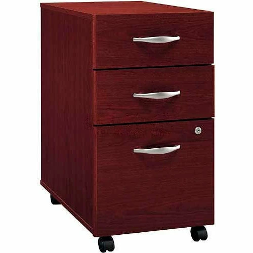 Enjoy mobile storage that works wherever you do. The Bush Business Furniture Series C 3 Drawer Mobile File Cabinet rolls smoothly on dual-wheeled, hooded casters for years of easy, everyday use. Slide the Cabinet under a coordinating Series C Desk to save space or move it around the office as needed. A single lock secures the bottom two drawers to protect your letter, legal and A4 files. The file drawer glides on smooth, full-extension ball bearing slides for an effortless reach to the back, and two box drawers store office supplies. Brushed Nickel hardware makes a lasting impression. The options are endless with Series C.