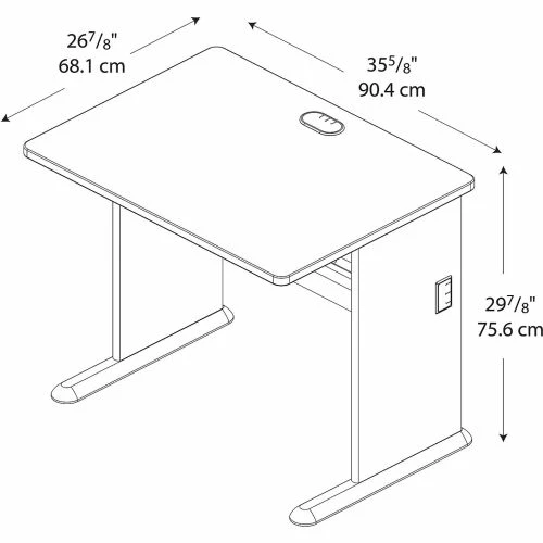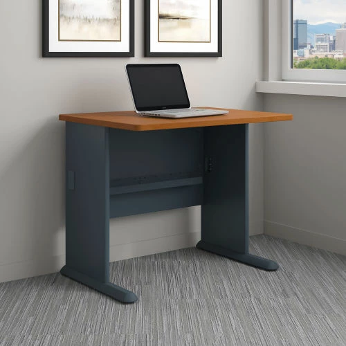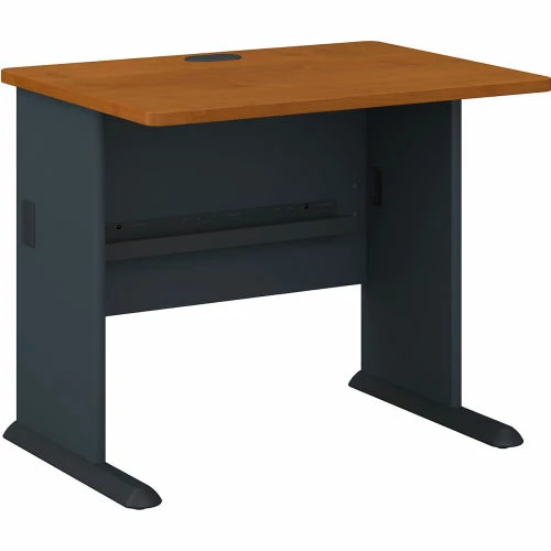Small but strong, the Bush Business Furniture Series A 36W Desk fits in tight spaces and endures years of everyday use. Thick end panels and a durable thermally fused laminate surface fend off scratches, stains and dents for long-lasting professional quality. The comfortable C-Leg design offers loads of legroom, while a comprehensive wire management system organizes and secures computer cables to keep them out of your way. Sturdy Desk feet include encapsulated steel armature and adjustable levelers for use on all types of flooring. The Office Desk accepts a coordinating Hutch, Mobile File Cabinet, Keyboard Tray or Pencil Drawer (all sold separately). Series A completes your multi-person workspace, classroom, home office or anywhere in between with a variety of configuration options. Featuring 7 attractive two-tone finishes, clean lines and contemporary styling, this commercial office furniture adapts to your surroundings. Customize any environment with a complete line of affordable products and accessories, all backed by a 10 Year Warranty. Series A withstands the rigors of a 40-plus hour week and meets ANSI/BIFMA quality test standards. American made with U.S. and imported parts.
