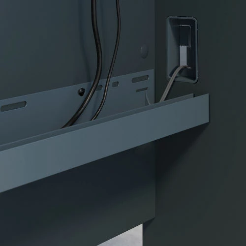 - Wire management system includes leg and desktop grommets with a channel on the modesty panel to keep cables under control