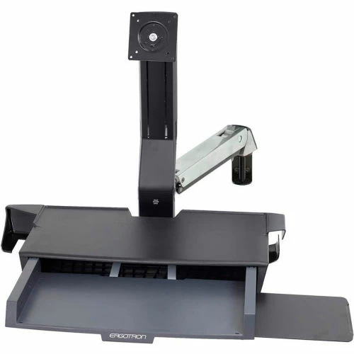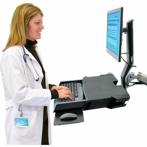 Durable polished aluminum construction! Also features a worksurface with pull-out keyboard tray, which facilitates caregiver workflow. Holds a monitor, bar-code scanner, keyboard, wrist rest and mouse on the same arm, providing easy, single-motion height adjustment. Work sitting or standing with the arm’s ergonomic 25″ (64 cm) LCD height adjustment range. A unique cable management system conceals and organizes cords, making cleaning easy.