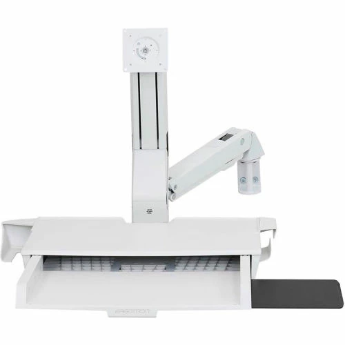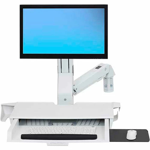 Durable polished aluminum construction! Also features a worksurface with pull-out keyboard tray, which facilitates caregiver workflow. Holds a monitor, bar-code scanner, keyboard, wrist rest and mouse on the same arm, providing easy, single-motion height adjustment. Work sitting or standing with the arm’s ergonomic 25″ (64 cm) LCD height adjustment range. A unique cable management system conceals and organizes cords, making cleaning easy.