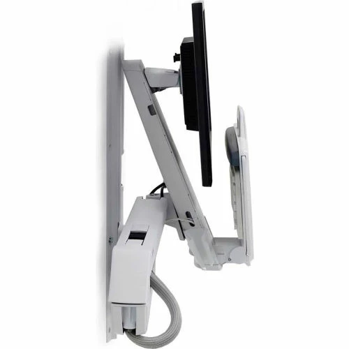 Durable polished aluminum construction! Holds a monitor, bar-code scanner, keyboard, wrist rest and mouse on the same arm, providing easy, single-motion height adjustment. Work sitting or standing with the arm’s ergonomic 25″ (64 cm) LCD height adjustment range. A unique cable management system conceals and organizes cords, making cleaning easy.