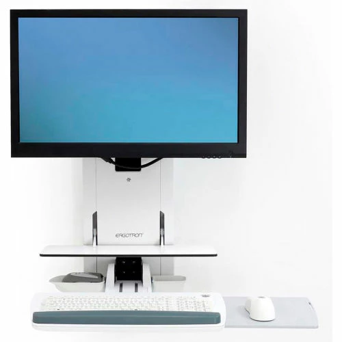 - Includes sit-stand lift chassis, monitor pivot, covers, shelf, retractable keyboard tray, slide-out mouse tray, wrist rest, mouse pouch, scanner holder