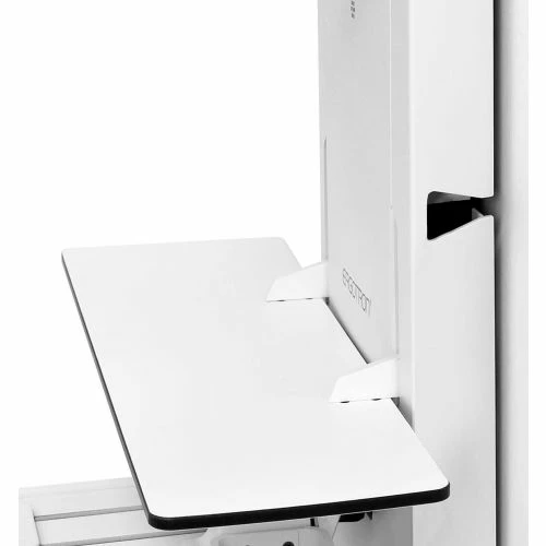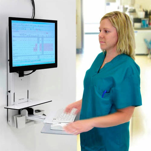 A very low-profile workstation that adjusts between sitting and standing working heights: With a storage depth of just 6″ (15.2 cm), it is the perfect solution for space-constrained patient rooms. Move the entire system – monitor, keyboard, mouse and scanner – in a single motion. The slide-out, back-tilt keyboard enhances user comfort, while the monitor and keyboard pan capability promotes patient-caregiver interaction.