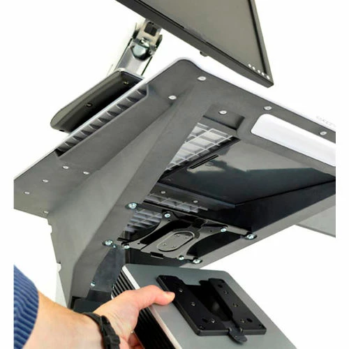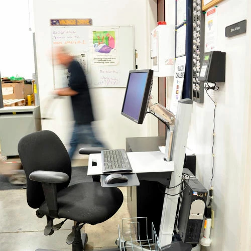 This low-cost, height-adjustable computer cart supports your mobile computing needs today and tomorrow. It features a fully adjustable LCD Arm, 27 inches (68 cm) of height adjustment (work sitting or standing), VESA-compliant thin-client CPU holder, large worksurface, small footprint and a rugged, open-architecture design. Use it anywhere computing needs to be mobilized: in a hospital as a point-of-care work space; in manufacturing as a mobile EWI platform; in the IT department as a diagnostic “crash cart.”