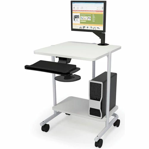 Add the ergonomic adjustability of a keyboard tray onto a small cart. The caddy’s platform includes an integrated foam wrist rest and an oval mouse extension that pivots out from the right side.