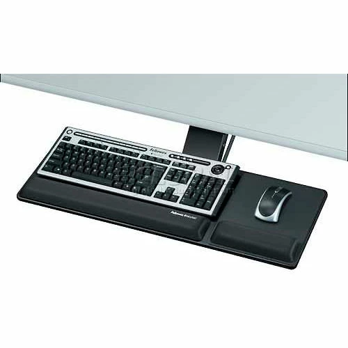 Fellowes® Designer Suites™ Compact Keyboard Tray enhances comfort in smaller workspaces. Loosen single knob to adjust tray height and tilt, then retighten knob to lock in position. Warning Trak™ helps prevent mouse from sliding off platform. Standard platform accommodates both right and left-handed mousing. Soothing memory foam wrist supports with Microban® antimicrobial protection stay cleaner and place hands/wrists in neutral position. Features compact 17-5/16″ glide track to fit restricted workspaces. Non-skid pads prevent undesired keyboard movement.