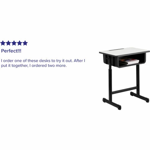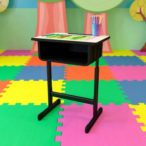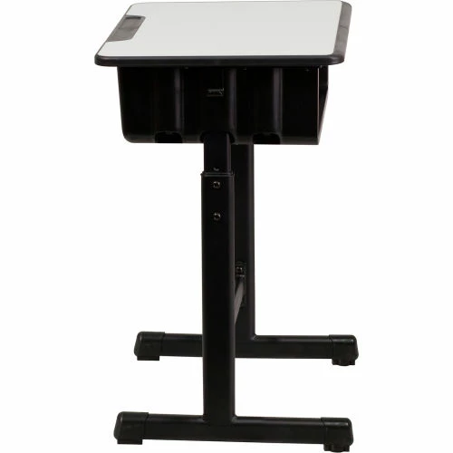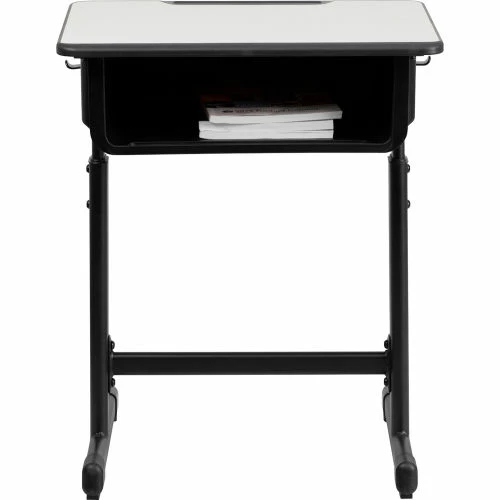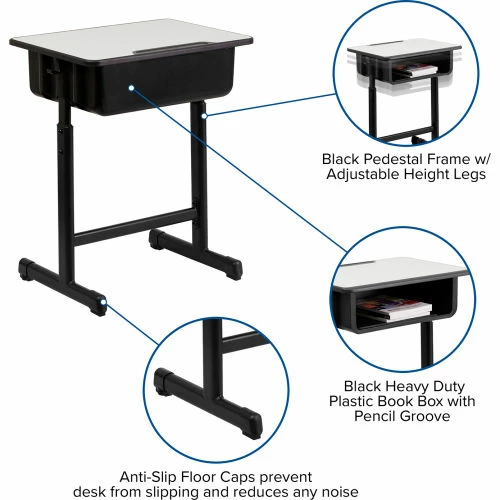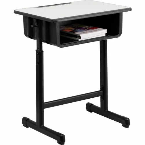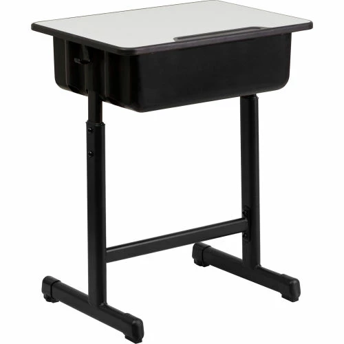 Supply students with proper furniture for learning with the popular open front student desk. No longer a standard size, with an adjustable frame this desk can be used for students of various heights. With the adjusting capability you can purchase one style of desk to fit your whole student body, the desk accommodates users from elementary to high school ages. Teachers will love this desk with two included book bag hooks to keep the floors clear of book bags and personal items. The pedestal frame adds a sturdy design that was designed to last you for years.
