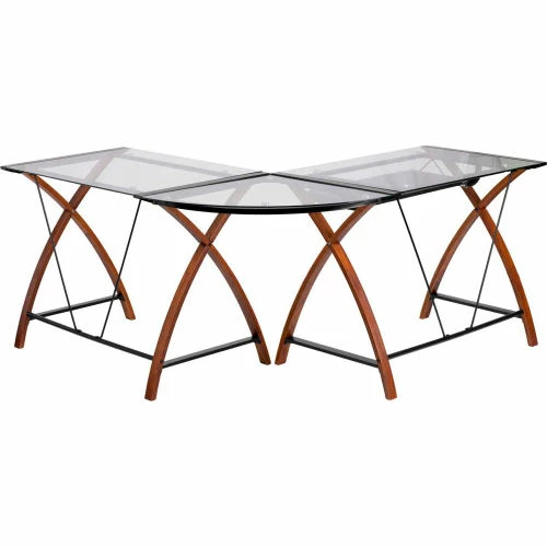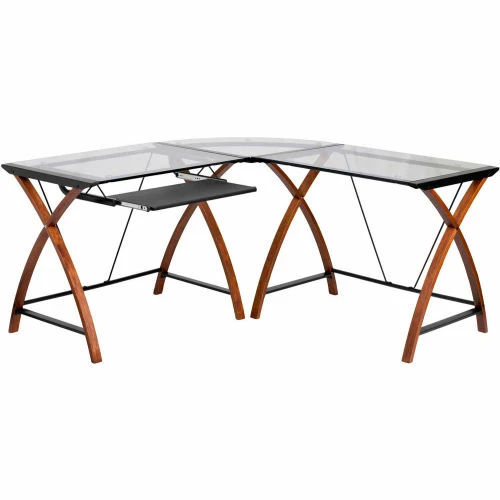 It features 2 clear tempered glass desk surfaces and corner surface that connects them, a space-saving, sliding keyboard tray and crisscross cherry finished legs. A powder-coated finish protects the frame from scratches and floor glides protect your floor by sliding smoothly when you need to move the desk.