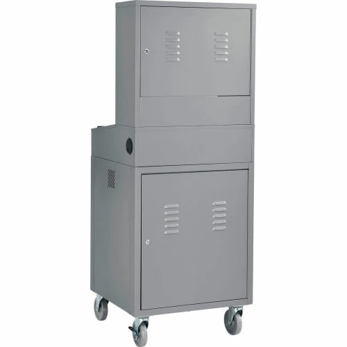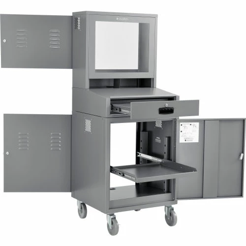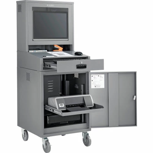 The Global Industrial Mobile Security LCD Computer Workstation is the quintessential workstation for keeping your computer protected and available for use. This steel computer cabinet enclosure is designed to hold LCD flat panel monitors up to 24″ diagonally while physically helping protect your computer equipment and data from surrounding hazards, vandalism, and insider hacks. This Enclosed Computer Cabinet is perfect for businesses that wish to conform to Payment Card Industry (PCI) Compliance with physical protection. Also perfect for use at construction, manufacturing facilities or public use. The locking monitor compartment in the enclosed computer cabinet includes a break-resistant window framed in heavy-duty 20 gauge steel. The computer cabinet unit comes with a convenient sloped writing surface and 2 organizing compartments for 8-1/2″ x 11″ papers. Keyboard/optional mouse tray and height adjustable printer shelf extend fully on steel ball bearing slides. Lower compartment has front and rear doors. Cable management openings throughout. Rear panels are louvered to regulate heat. Moves on 4 industrial swivel casters (2 with brakes). Powder coat finish. Optional Fan with 5-foot power cord reduces heat build-up. Order one fan for each upper, lower and side car cabinet. Optional side shelves, side car cabinet, fan and sliding mouse tray sold separately. Also available in fully-assembled unit (model# 239115GYA).