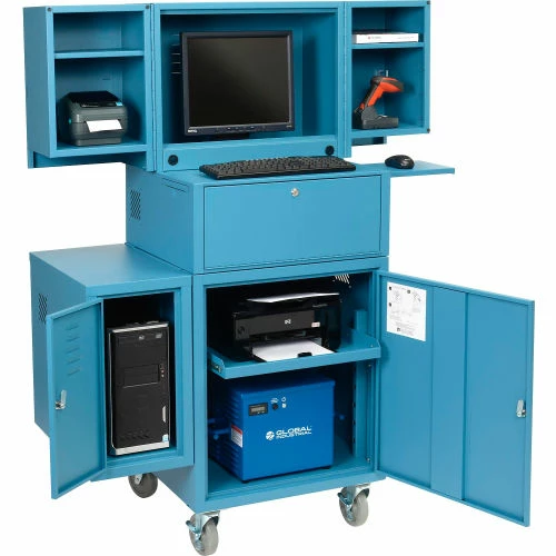 Looking for a convenient and compact computer security cabinet? The Global Industrial Mobile Powered Fold-Out Computer Cabinet is a versatile and adaptable solution. It features two fold-out storage cubbies that double as a locking security enclosure. Each storage cubby has an adjustable shelf. Also featured are both left and right retractable mouse trays, providing even more work space. The middle locking cabinet can be used for storage or for your desktop PC. The middle cabinet interior is large enough for almost any desktop computer. The bottom cabinet also incorporates a front a rear locking door as well as a height-adjustable shelf for peripherals or other items. Moves on 4 industrial swivel casters (2 with brakes). All locks are keyed alike for convenience.