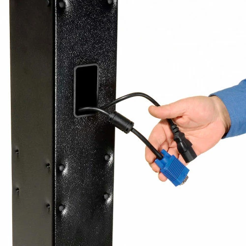 This super strong 5″ x 5″ steel center post with base bolts to the floor with the stationary base (mounting hardware not included) for stability. To hide all cables, the post includes 3 cable management openings at 15″, 42-1/2″ and 70″H. Permits mounting of work surfaces at 30″ or 40″H. Permits mounting of monitors at 52″, 66″ or 80″H. Post base measures 17-1/2″ x 17-1/2″. Powder coat finish.