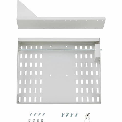Made of heavy duty steel, this laptop tray includes a locking bar for security (2 keys included). The tray measures 18″W x 14″D and fits most 17″ diagonal-screen laptops and Chromebooks. Durable powder coat finish. The panel is perforated for ventilation. Easily installs to any Global Industrial™ orbit workstation posts.