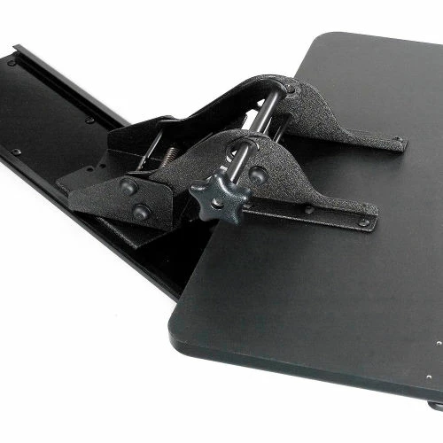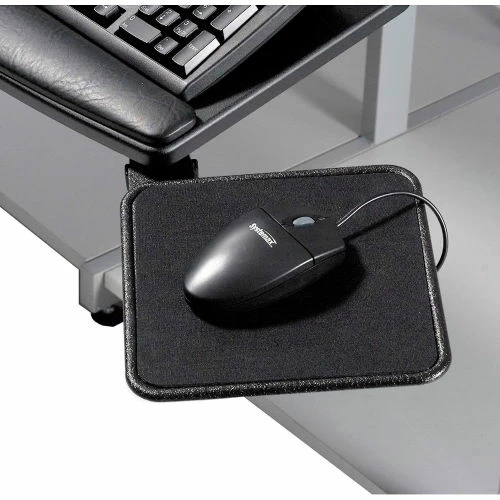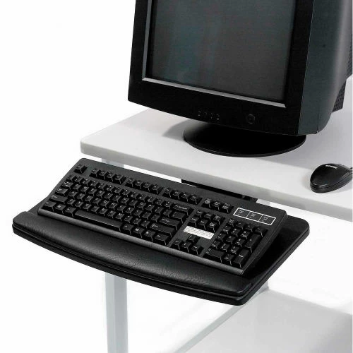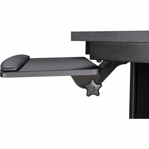 This functional tray with a wrist rest attaches below the work surface. Adjusts up to 5-3/4″, tilts 15° and swivels 360°. Slides out of the way when not in use. The length of the track the keyboard slides on is 5-1/8″ long. The length of the tray the keyboard slides on is 17-3/4″ long. The length of the keyboard tray is 20-1/8″. The width of the keyboard tray is 11″. Optional Mouse Tray (Item # 190289) is available and sold separately.