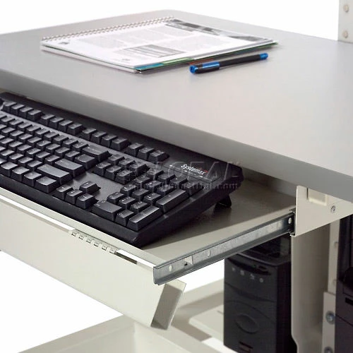 This rectangular work surface features a sturdy 1″ thick wooden core finished in rugged plastic laminate and measures 36″W x 20″D. Provides ample room for keyboard, mouse and other materials. Can be mounted on any Orbit Computer Workstation post.