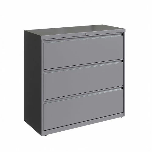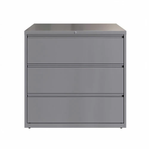 This 42 in. wide 3 drawer commercial grade lateral filing cabinet is designed for heavy duty use, yet looks great in any office. Precision ball-bearing suspension allows for quiet use in your busy office environment. Fully welded steel construction with reinforced base. Interlock system prevents tipping by only allowing one drawer open at a time. Dual lock bars and core-removable lock come standard. Unit includes hang rails, magnetic label holders, and four adjustable leveling glides. Greenguard Gold certified for indoor air quality. Meets or exceeds ANSI/BIFMA standards. TAA compliant. Limited Lifetime Warranty.