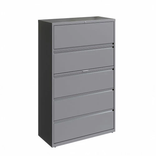 This 42 in. wide 5 drawer commercial grade lateral filing cabinet is designed for heavy duty use, yet looks great in any office. Precision ball-bearing suspension allows for quiet use in your busy office environment. Fully welded steel construction with reinforced base. Interlock system prevents tipping by only allowing one drawer open at a time. Dual lock bars and core-removable lock come standard. The top drawer features a roll-out shelf designed to accommodate 3-ring binders. Unit includes hang rails, magnetic label holders, posting shelf, and four adjustable leveling glides. Greenguard Gold certified for indoor air quality. Meets or exceeds ANSI/BIFMA standards. TAA compliant. Limited Lifetime Warranty.