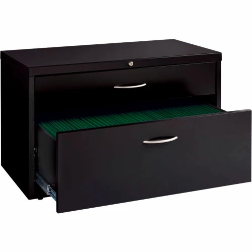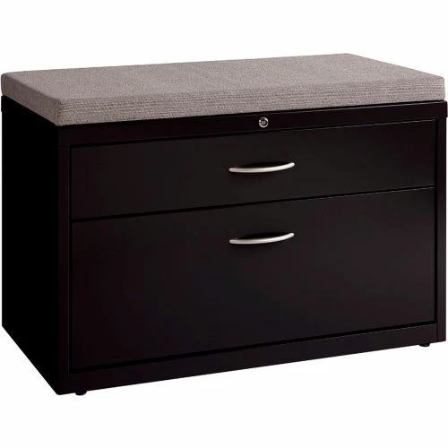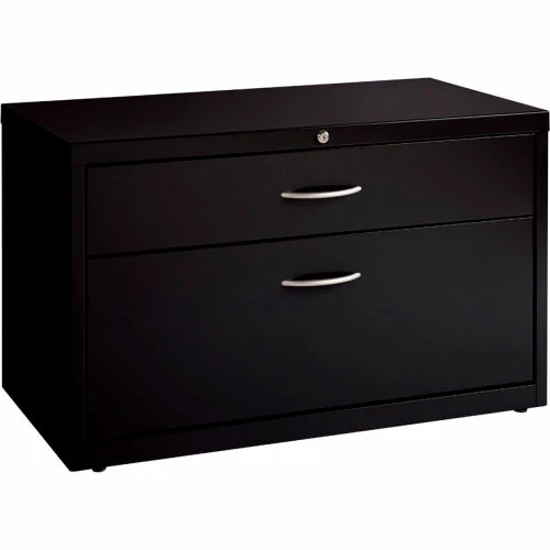 Hirsh Credenza 2-drawer box/file lateral cabinet is designed for the modern office and will forever change how you store your files. The reinforced base construction leads the commercial use into a new fashion. Precision ball-bearing suspension provides a smooth and quiet drawer performance. Secure private files thanks to the cabinet’s factory installed core lock. The satin nickel arch pull handles add to the modern style of this cabinet while the baked enamel finish offers an attractive matte look that complements any decor. Includes drawer dividers for the 6″ supply drawer. Unit meets or exceeds ANSI/BIFMA industry standards. Greenguard Gold Certified.