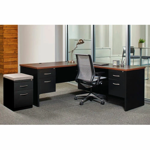 Hirsh Modular Desk Series are the professional desk solution ideal for the business, educational, and governmental office environments. This executive style desk features full height end panels and modesty panels with satin nickel arch pull drawer handles for a contemporary leading-edge design. Modular desks are available with double pedestal file drawers or single pedestal file drawers in right hand or left hand configurations. All box and file drawers feature full extension slides to give you maximum user range. Make a style statement with the model that fits you best. A central lock system locks drawers to keep your papers and office essentials away from prying eyes. Grommet holes in the desk top provide cord management to keep you organized and uncluttered. Leveling glides for added stability and radius profile edgebanding gives enhanced comfort. Modular desks come standard with one drawer divider per box drawer and one pencil tray per desk except desk returns. Desk meets or exceeds ANSI/BIFMA performance and safety standards. Greenguard Gold Certified.