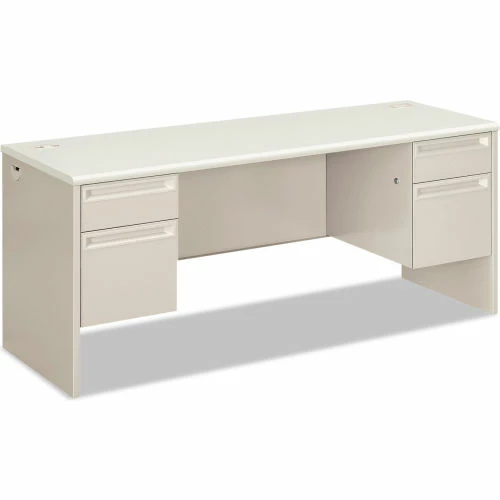 Steel frame with steel-reinforced, high-pressure laminate top for superior rigidity and strength. Drawers operate on heavy-duty steel ball bearing suspensions. High-sided, full-extension file drawers accept hanging file folders; box drawers extend three-quarters. HON® “One Key’ core removable locks. Convenient cord management grommets.