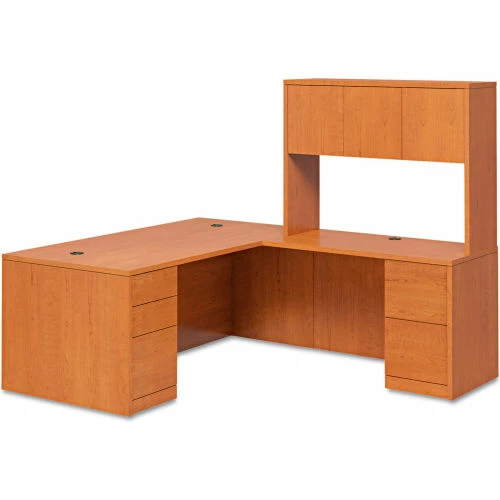 Hard-working, good-looking and built to survive a lifetime of overtime. Thermally-fused laminate top and end panels are abrasion- and stain-resistant. Drawers operate on ball bearing suspensions; file drawers extend fully and accommodate letter or legal size hanging files, box drawers extend three-quarters. 10 1/2″ conference overhang provides kneespace for guests. HON® “One Key” core removable locks make re-keying quick and easy. Full-height modesty panel for privacy. Two cord management grommets. Desk and Return sold and shipped separately–ORDER BOTH.