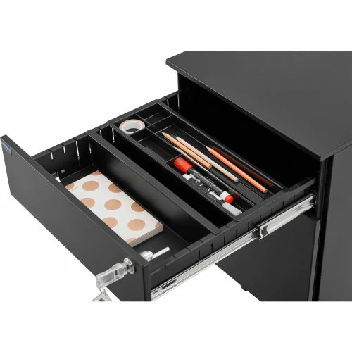 Interion® By Global Industrial 2-Drawer File Cabinet includes 1 box drawer and 1 file drawer. Box drawer includes plastic divider and accessory tray. File drawer includes hang rail to convert from letter sized to legal sized filing and 1 caster to offer support and easy drawer maneuverability. 4 adjustable glides at the base create stability on uneven surfaces. Made of durable steel. Keys are not keyed alike.
