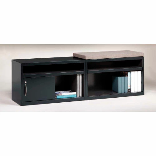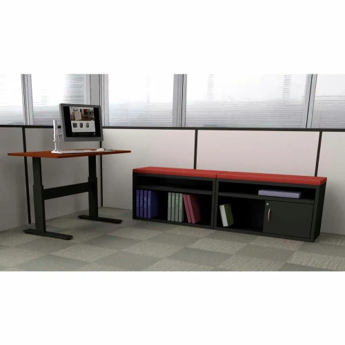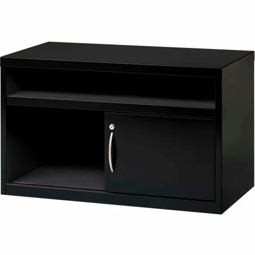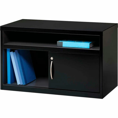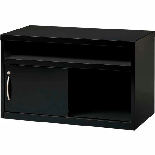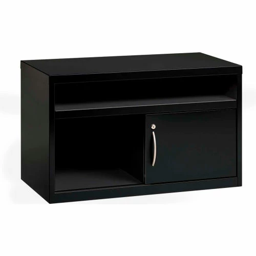 This 36 in. wide commercial grade credenza cabinet with sliding door is designed for both storage and seating and looks great in any office. Features one fixed shelf and one shelf with a sliding door for concealed storage. The sliding door can be locked on either side.