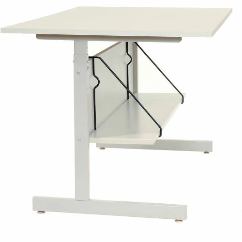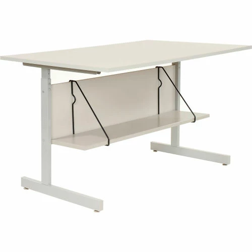 Durable utility shelf is made with box formed steel for extra strength. Includes 2 shelf brackets for tool free installation. Baked enamel finish. Brand is Interion® By Global Industrial. Shelf easily attaches to modesty panel of Adjustable Height Work centers (sold separately) to provide additional storage space.
