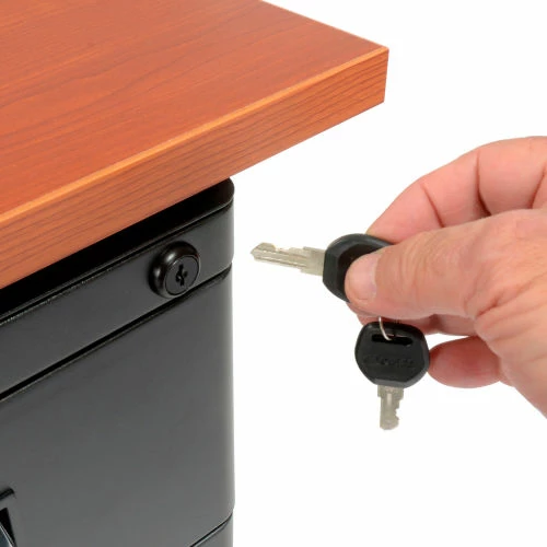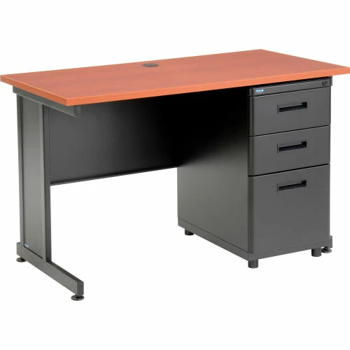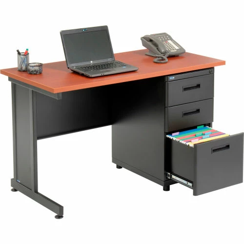 Interion® By Global Industrial Office Desk features 1″ thick scratch resistant laminate work surfaces on a charcoal finished steel frame. Desktop includes 2-3/16″ diameter cable management grommet opening. Desk includes modesty panel and adjustable leveling glides. Steel File Cabinet features 2 box drawers and 1 file drawer that accepts letter or legal size filing. Pedestal includes ganged cylinder lock, recessed handles and adjustable leveling glides. 1 Year Limited Warranty.