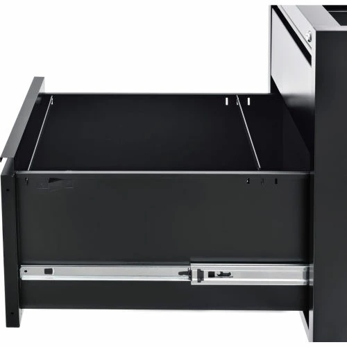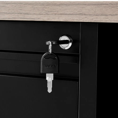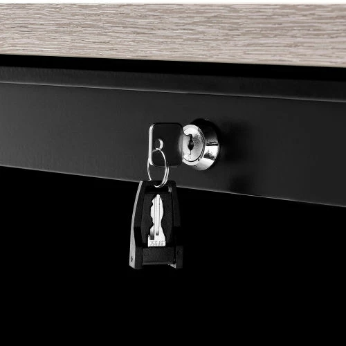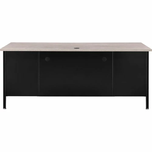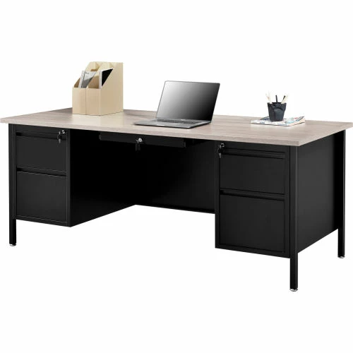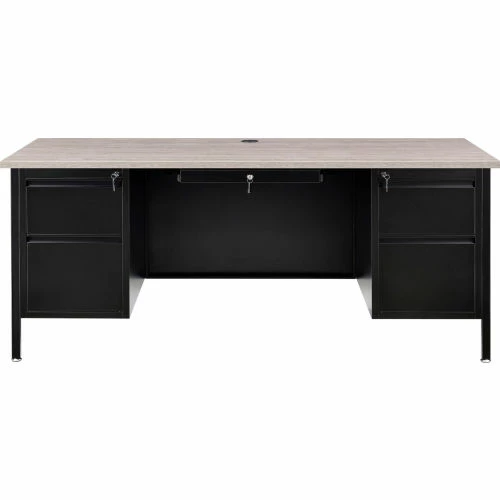 These modern and updated Teachers Desk From Interion® By Global Industrial are a great addition to any classroom or office. Sturdy steel base adds long lasting durability while the laminate top is easy to clean and maintain. Double drawer pedestals include 1 file cabinet on each side which holds both letter and legal sized files. Pull out pencil drawer allows easy access for small accessories. 2 sets of keys are included (not keyed alike). Grommet holes on the tabletop and on the back panel allow for easy cable wiring. Adjustable height feet glides allow you to level your desk on any surface.