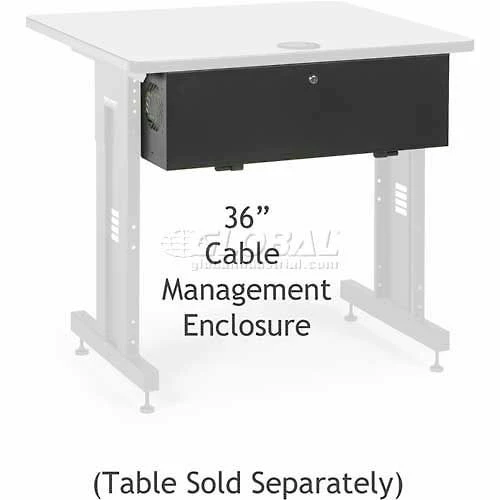 The Kendall Howard™ Training Table Lockable Cable Management Enclosure encases and hides the surface and modesty panel cable entrance points, providing a clean, polished look. The Cable Management Enclosure also provides a cable lock point for computer security devices to be secured to, protecting community or public equipment. Multiple knock-outs provide easy cable routing down to the CPU or from desk to desk. The included fan pattern allows you to install an optional fan kit, providing additional airflow especially when heat generating equipment is housed inside. Compatible with the 36 W Training Tables. Installation hardware included. Black powder coated steel.