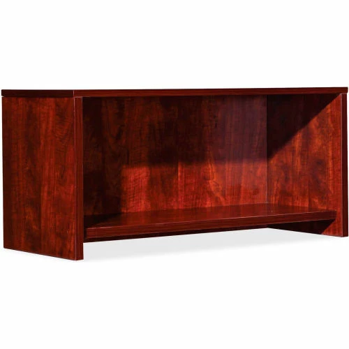 Expand your overhead storage opportunities with this wall-mounted hutch. Use over a desk, lateral file and more to customize your work area. Wall-mounting means you don’t have to use an exact width match. Cherry finish and design match the Lorell® Essential Series furniture. In case you need privacy for your storage, door kits in glass (B2187911) and wood (B2187812) for this hutch are sold separately. Bottom panel and side panels are almost 1″ thick (25mm). Back panel is approximately 5/8″ (16mm) thick. Top panel is approximately 5/7″ (18mm) thick. Design also includes 1mm and 3mm PVC edgebanding.