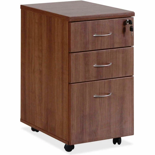Freestanding, mobile pedestal is part of Lorell® Essentials Series Laminate Furniture with high-quality laminate construction and a contemporary design. Pedestal offers a box/box/file configuration. The file drawer includes hangrails and holds letter-size and legal-size hanging files. Walnut laminate top is 1″ thick for durability. Pedestal rolls easily on four 1-1/2″ dual-wheel casters. Design also includes 96mm metal drawer pulls with a silver brush finish and 3mm PVC edges.