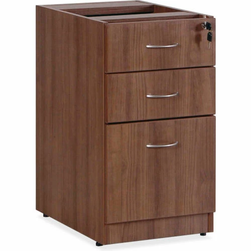 Hanging pedestal is part of Lorell® Essentials Series Laminate Furniture with high-quality, Walnut laminate construction. Pedestal offers a box/box/file design to store office supplies and important files. The file drawer includes hangrails and holds letter-size and legal-size hanging files. Design also includes 96mm metal drawer pulls with a silver brush finish and 3mm PVC edges. Pedestal attaches to the underside of the top of an Essentials Series desk, credenza or return with the included fasteners and extends to the floor.