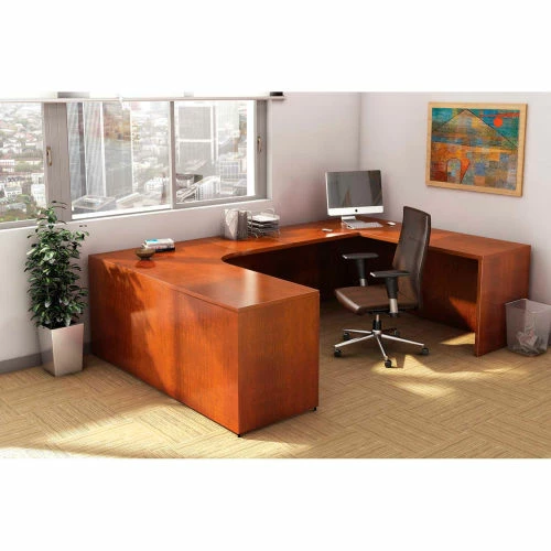 Rectangular desk shell is part of Lorell 69000 Series Laminate Furniture with high-quality laminate construction and metal-to-metal cam-lock connections. Cherry laminate top is 1″ thick for durability. Use the two grommet holes in the top for easy cord routing. Design also includes a full modesty panel, 3mm PVC edges and adjustable feet.