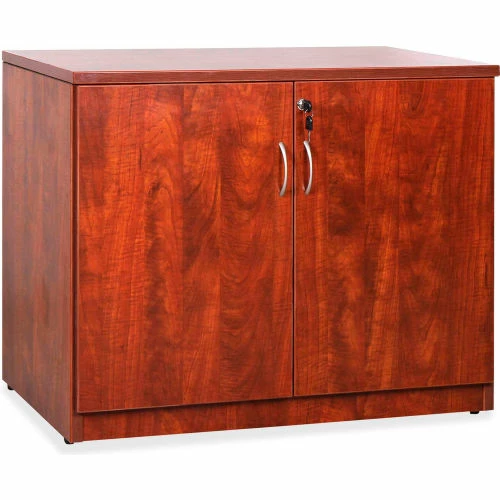 Two-door storage cabinet is with Lorell® Essentials Series Laminate Furniture. The Essentials Series offers high-quality laminate construction and a contemporary design. Top, side and shelf panels are made of 25mm melamine-faced chipboard. Other panels are made of 18mm melamine-faced chipboard.