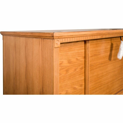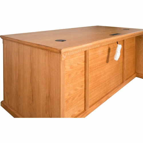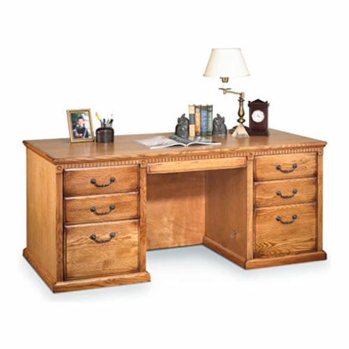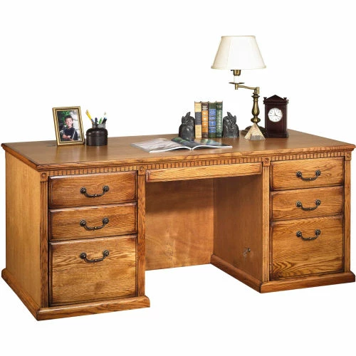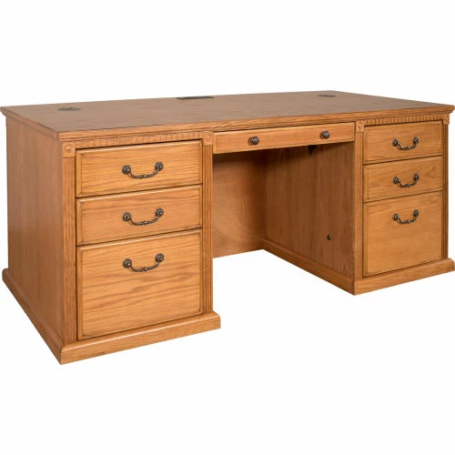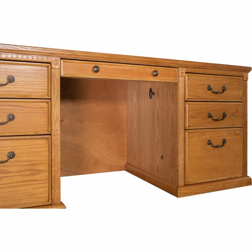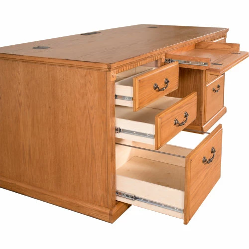 The Huntington Oxford office collection boasts a transitional furniture design built with hardwood solids and veneers. It is available in a traditional oak finish or warm burnish brown finish. The Huntington Oxford collection incorporates a highly detailed finish with hand-applied distressing that includes rasping, wear sanding, dry brushing and pin holes to create texture and depth. This delivers a unique, special worn appearance of fine furniture that has withstood the test of time. The natural grain and beauty of the wood is enhanced by a multi-step, hand rubbed finish. Vertical fluting and dentil molding further add character and aesthetic appeal. The desk features two letter/legal file drawers, one pencil drawer and four utility drawers for storage. Arrives fully assembled.
